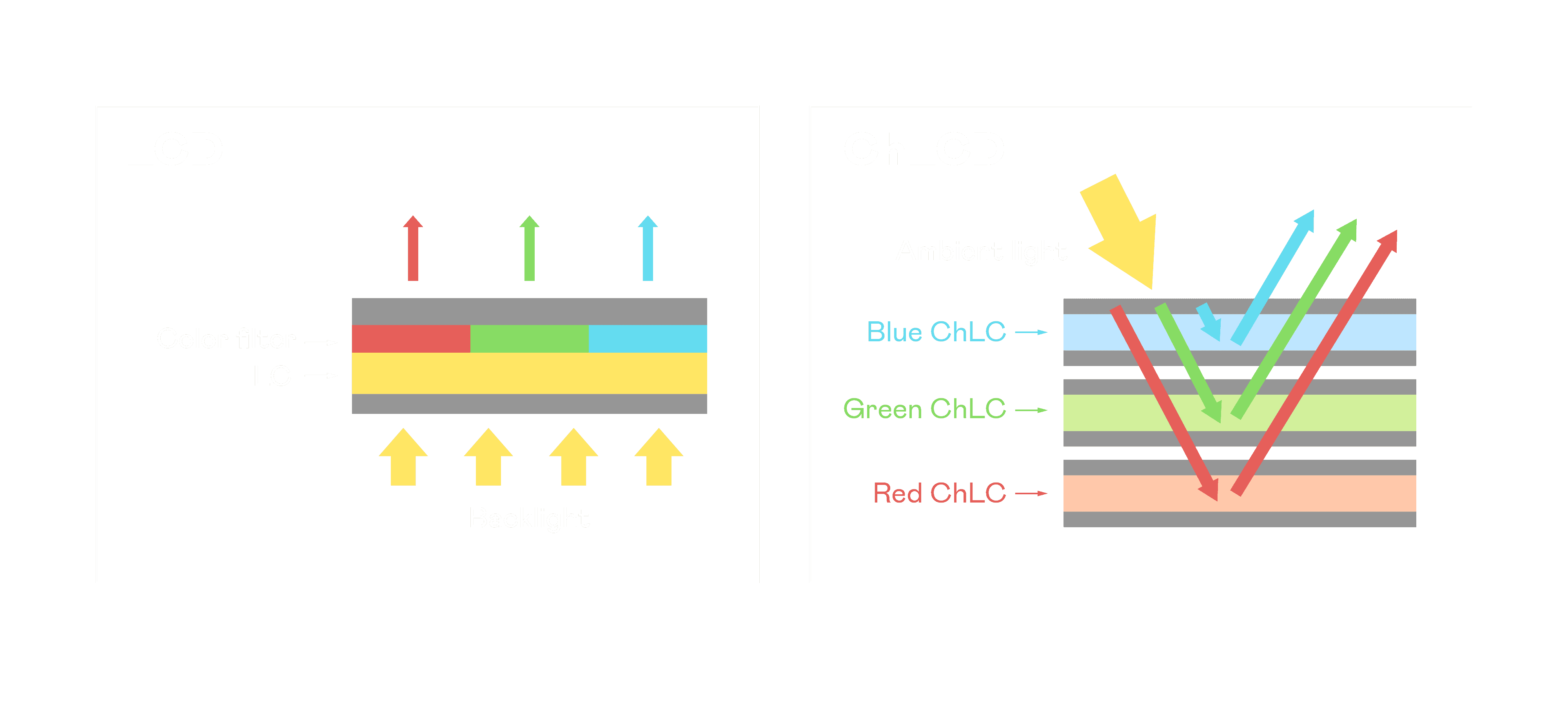 ChLCD 胆固醇液晶就如同纸张一样,,,透过反射环境光来显示影像,,因此长时间观看不易造成人眼视觉疲劳,,,,可达到护眼效果。。。。当处于户外阳光下使用,,,,LCD 影像容易失真而不易观看,,,但胆固醇液晶仍可维持较佳的影像品质。。。